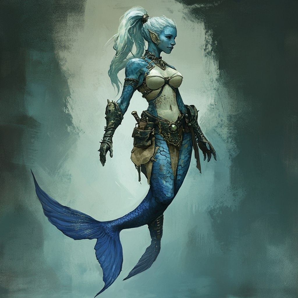 Создано на основе запроса: D&D female character merfolk underwater, blue skin, 2 humanoid legs, one tail, owner of an underwater antique shop