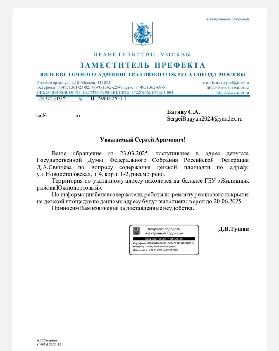 Сколько понадобится лет, чтобы сделать нормальное покрытие на детской площадке по адресу Новоостаповская дом 4к1 и к. 2 ? Вопрос сакральный. Комиссии Префектурные приезжали поэтому адресу, и даже некоторые причастные к участку обслуживания говорили, что нет сотрудников, которые могут качественно положить крошку и грозились увольнением, если вновь появится информация, что работы по укладке покрытия выполнены плохо. Это все не чья-то театральная постановка. Хотя как знать... А пока зафиксируем дату. И будем как всегда надеяться, что обещание устранить и сделать все работы в срок воплотятся в реальность. И жители смогут в полной мере воспользоваться площадкой в этом году. #ЛДПР #Южнопортовый #БагянСергей