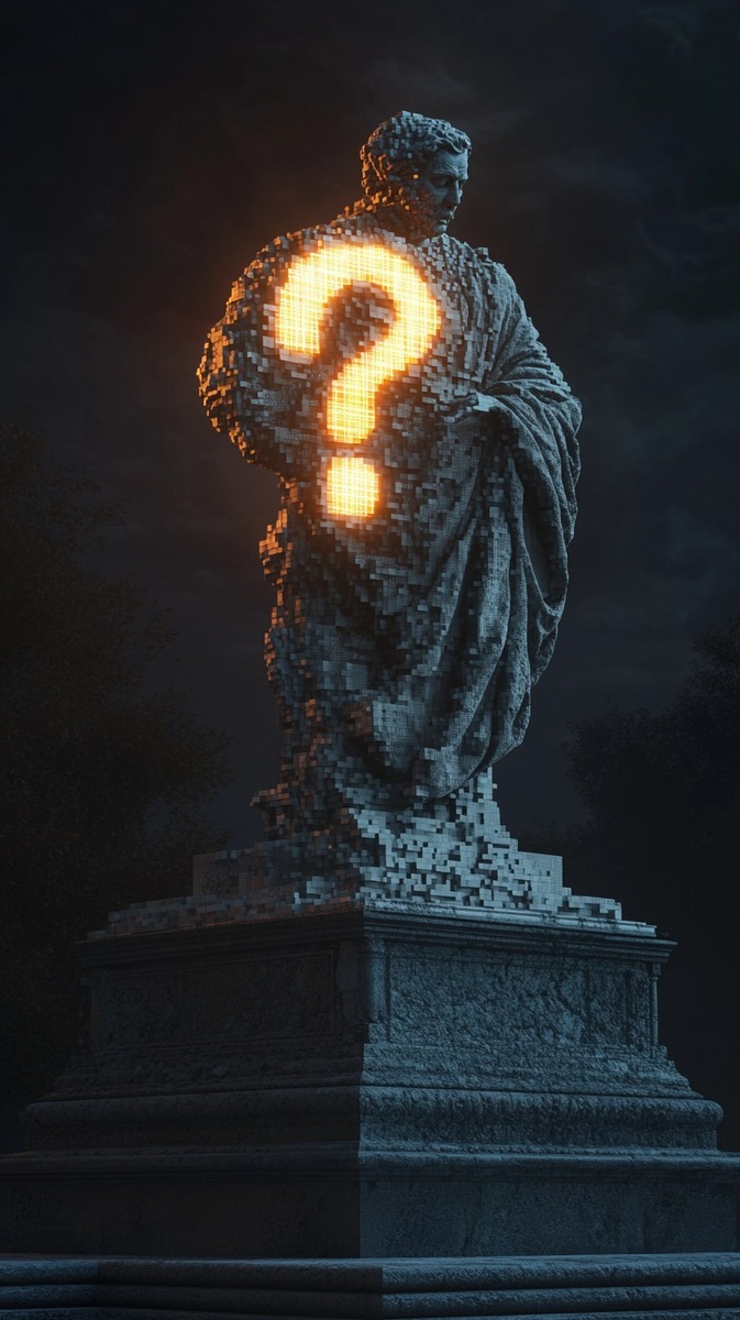 Создано на основе запроса: Granite statue of Columbus disintegrating into pixels, leaving glowing question mark floating, dark backdrop