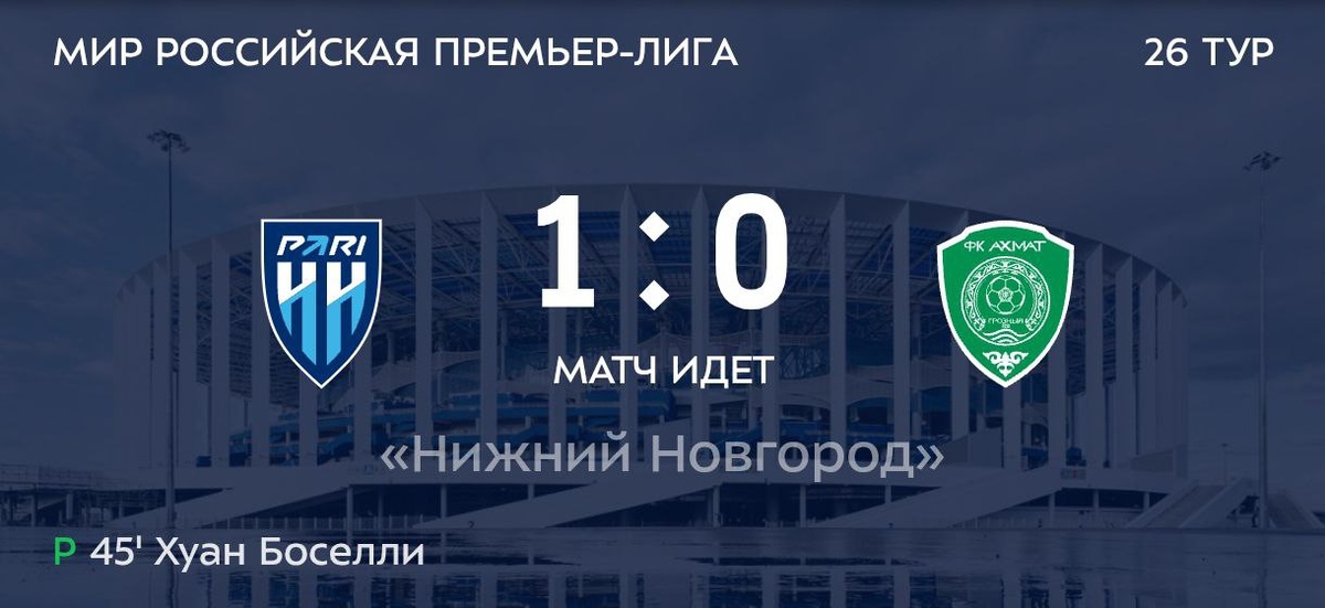 Неоднозначный первый тайм, в котором было больше борьбы, чем футбола. 14 нарушений у нижегородцев против 4 у «Ахмата», и на желтых карточках висят Мамаду Майга и Александр Трошечкин. Очень сложный второй тайм предстоит нижегородцам, в этом нет никаких сомнений. Надо сделать всё, чтобы удержать добытое в добавленное к первому тайму преимущество.