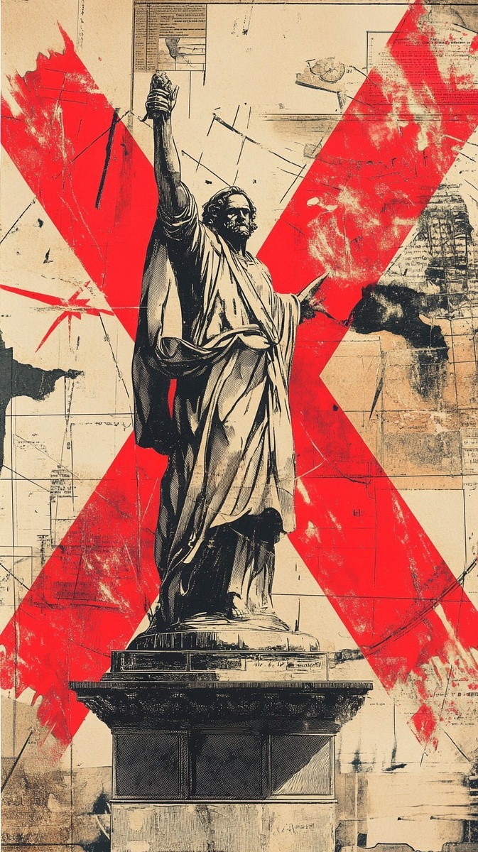 Создано на основе запроса: Stylized map outline of North America; a marble statue of Christopher Columbus pushed back by a big red X stamp, dynamic comic style motion, bold colors, vertical