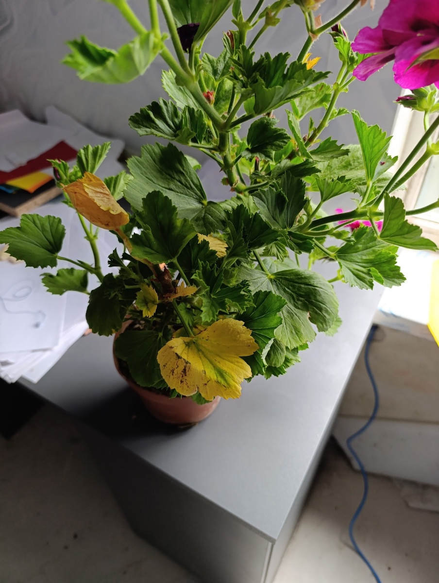 Здравствуйте подскажите пожалуйста почему желтеют листья у герани.