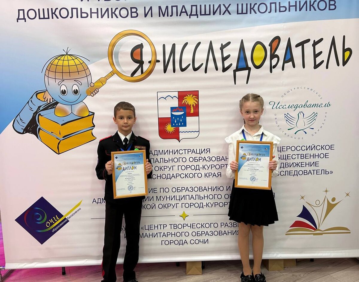 С 24 по 26 апреля учащиеся нашей школы Гутмахер Варвара (3г класс, руководитель Колесникова Н.И.) и Плешаков Павел (3в класс, руководитель Казакова Е.А.) приняли участие в XVIII региональном конкурсе исследовательских работ и творческих проектов дошкольников и младших школьников «Я-исследователь» в городе-курорте Сочи.☀️ В данном конкурсе приняли участие 188 ребят школьного и дошкольного возраста со всего Краснодарского края. Наши ребята выступали в секции «Живая природа»🍀. По итогу защиты проектов все были награждены дипломами и подарками. 🏆Плешаков Павел Лауреат. 🏆Гутмахер Варвара Дипломант 1 степени. Ребята большие молодцы!!! 🙌Желаем не останавливаться на достигнутом, стремиться к большему, всегда быть удачливыми и успешными!!!🎯