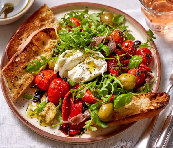 Этот рецепт аппетитного салата наполнен множеством восхитительных вкусов и текстур. Помидоры, зеленые оливки, моцарелла, анчоусы, бальзамический уксус и руккола — вот лишь несколько ингредиентов, из которых состоит этот сытный, яркий салат. Подается на двоих.