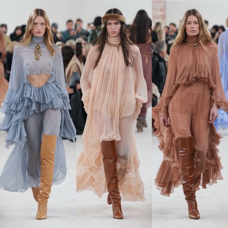 Инфлюэнсеры расхватали эти образы, как горячие пирожки. Коллекции Chloe были, как глоток свежего воздуха - нежные, легкие, романтичные. Пудровое платье макси, заправленное в сапог , стало визитной карточкой и объектом желаний модниц.