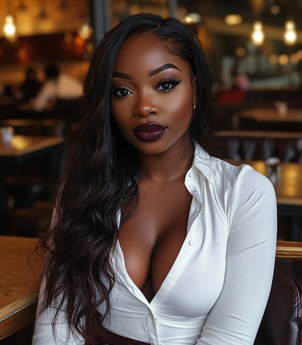 Создано на основе запроса: A photograph of a beautiful Black woman sitting in the background of an upscale restaurant, dressed for a date night. She wears a white shirt and has long hair, with a casual smirk and dark lipstick. --- Автоперевод: Фотография красивой черной женщины, сидящей на заднем плане высококлассного ресторана, одетая на свидание. Неплохо получилось? 🤔 https://dzen.ru/id/65c0c65c86e4f837c27b24d7 #ИИ #AI #нейросеть #midjourney #art