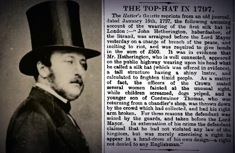 Самый-самый конец XVIII века, обычная улица Лондона. И на ней, среди людей, появляется некий господин, у которого на голове весьма высокая шляпа. Его имя - Джон Хетерингтон. По профессии он галантерейщик. Его появление вызвало настоящий фурор.