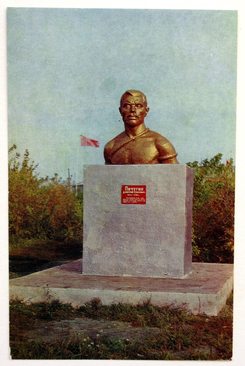 Издательство «Турист» Москва 1975г. Памятные места Зауралья. Фото А. Рыжкова. Село Пичугино Варгашинского района. Памятник Д.Е. Пичугину. Открытка прямоугольной формы. Тираж 50 000