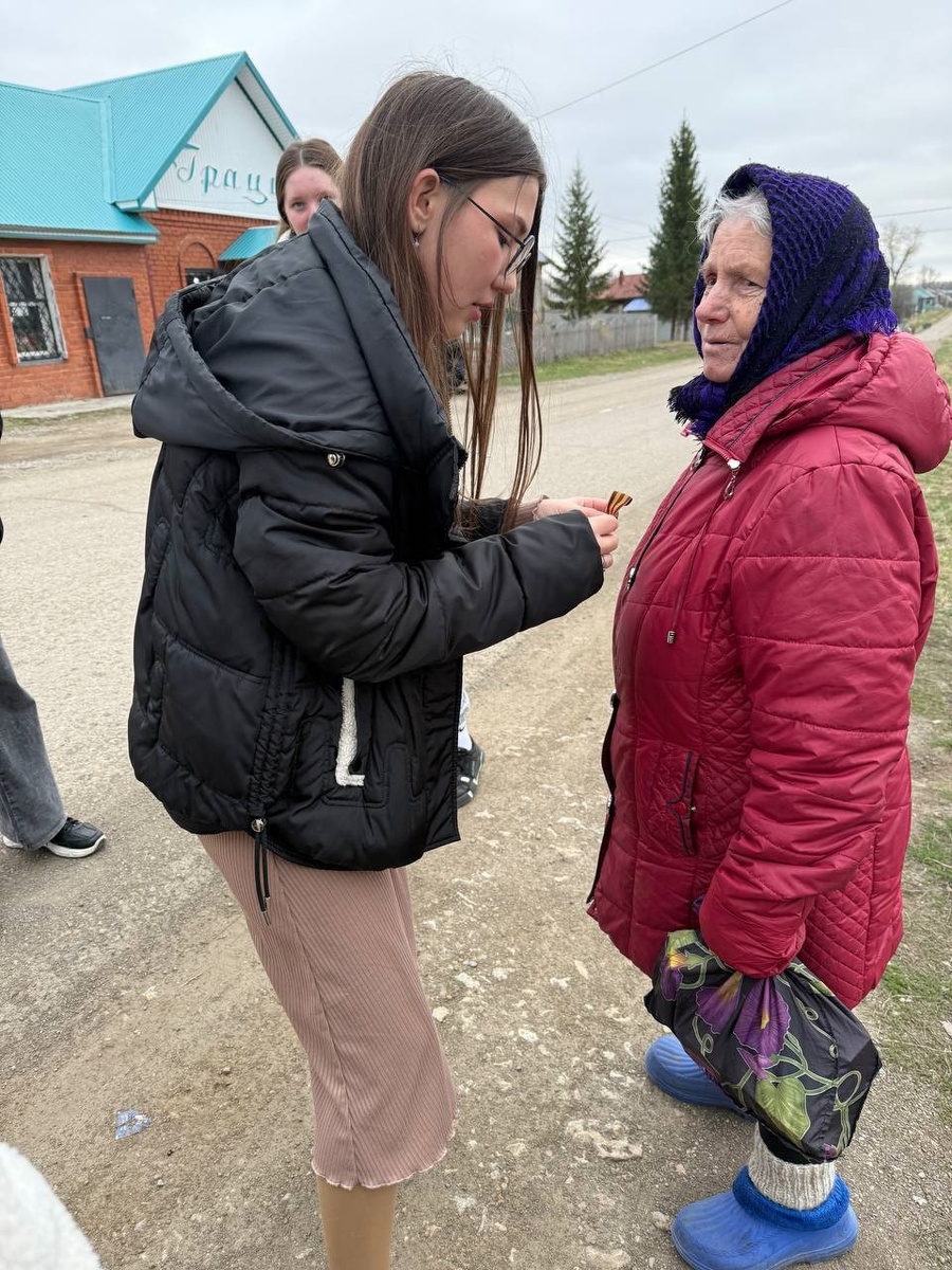 В преддверии Дня Победы в знак уважения и благодарности к подвигам отцов, дедов и прадедов в годы Великой Отечественной войны волонтеры Наргиза Мухаметова, Алена Ярушина и Полина Лешкова прикрепляли георгиевские ленточки студентам колледжа и жителям села.