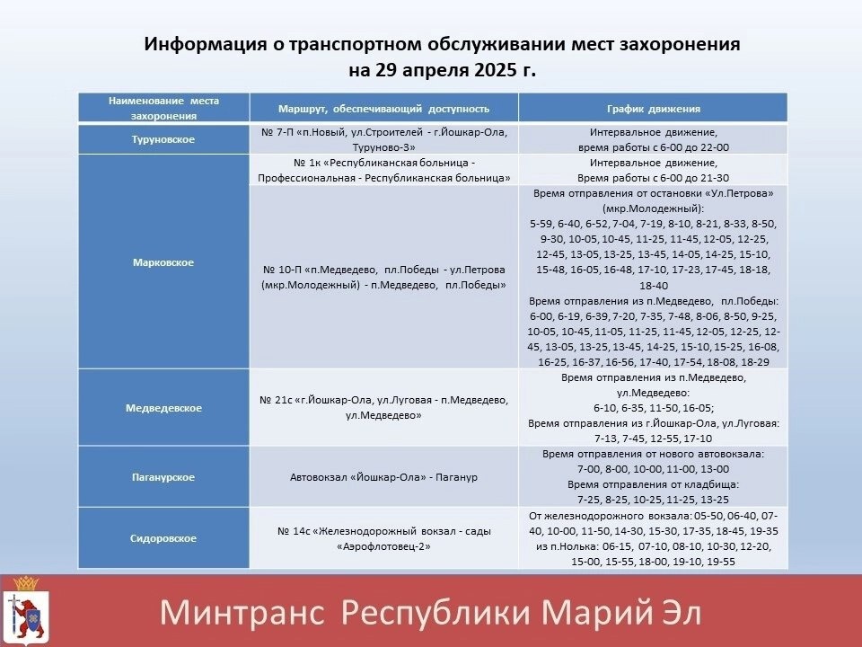 29 апреля в Йошкар-Оле будут курсировать дополнительные автобусы на кладбища Во вторник, 29 апреля, православные верующие отметят Радоницу. Для удобства жителей Йошкар-Олы Минтранс Марий Эл подготовил информацию о маршрутах, которые помогут добраться до Туруновского, Марковского, Медведевского, Паганурского и Сидоровского кладбищ.