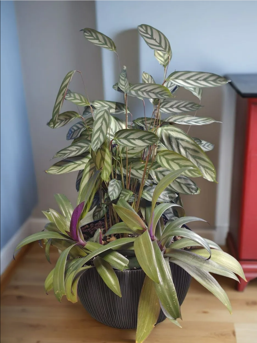 Очень мне нравится создавать миниатюрные клумбы в горшках. Во-первых место экономлю и вместо двух-трех горшков все сажаю в один)) Ну а во-вторых мне так просто красиво)) Вот тут было начало посадок, середина марта. Прошло чуть больше месяца, давайте посмотрим как композиции выглядят теперь. Делала я их из очень бюджетных растений, купленных на Авито. Самым старшим растением была Ктенанта Оппенгейма, купленная малышкой в двухсотмилилитровом стаканчике год назад, может чуть больше. Перед коллективной высадкой в горшок я ее поделила, детки нашли свой новый дом уже, а основное растение я ссадила с традесканцией Рео, которая мне досталась на Авито за 50р горшок с несколькими растениями. После высадки месяц назад все это выглядело вот так: Все традесканции я обрезала и макушки укоренила, они теперь растут красивым кустиком в отдельном горшочке. А в основном горшке наступило натуральное буйство и всего за один месяц))) Традесканция прекрасно обросла и ктенанта тоже заметно выросла. Эту пару м