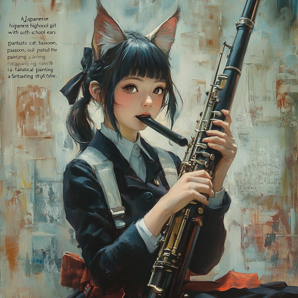 Создано на основе запроса: "A Japanese high school girl with cat ears playing the bassoon, painted in a fantastical oil painting style."