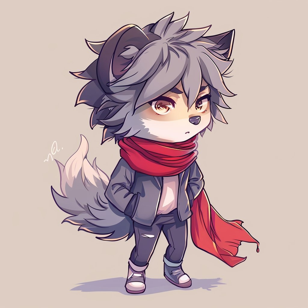 Создано на основе запроса: cute semi-realistic chibi wolf boy, light grey fluffy fur with detailed texture, slightly cool but gentle expression, small red scarf, standing alone with a shy pose, slightly realistic proportions, soft lighting, sticker style, pastel background