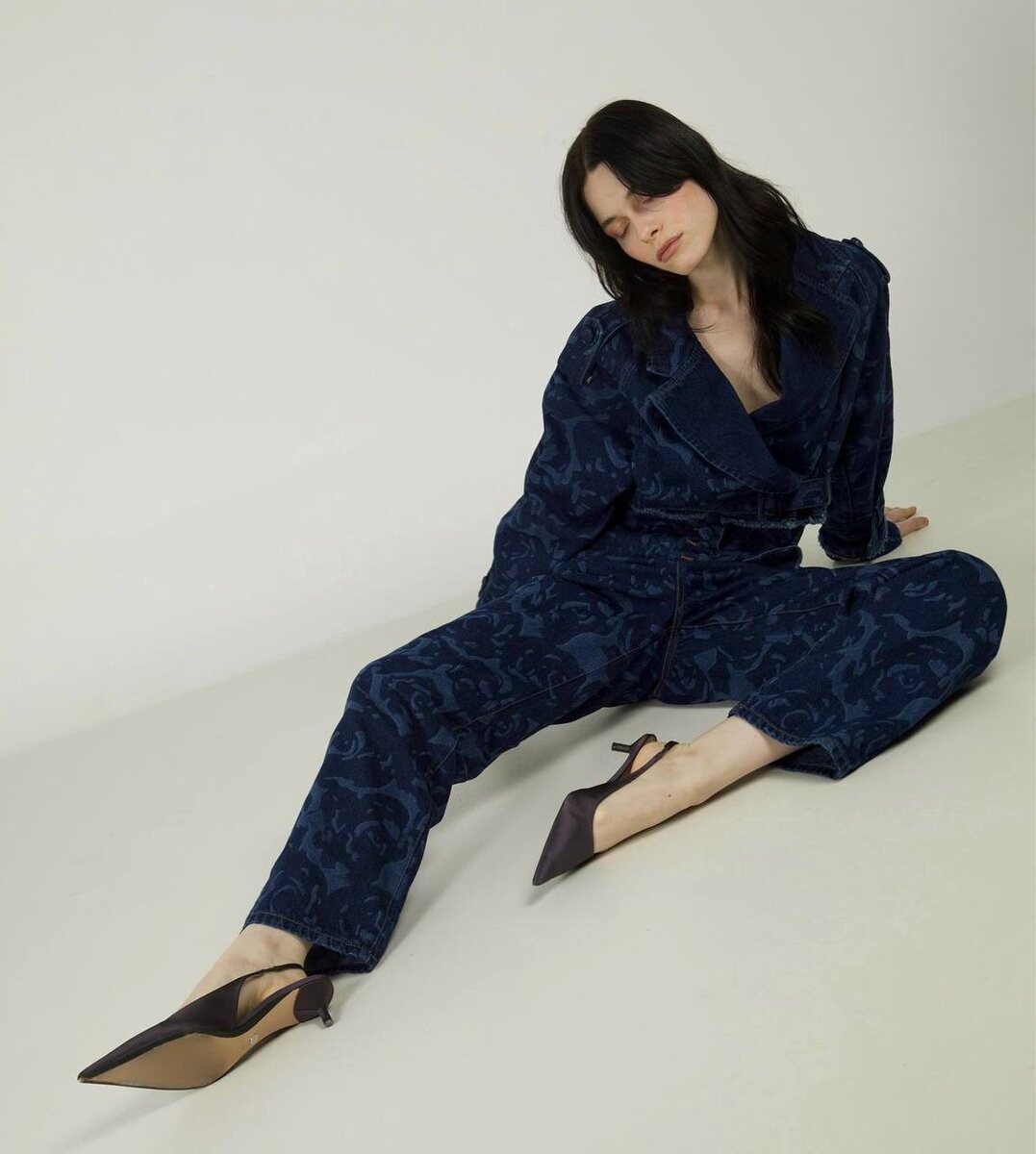 Тонкий жаккардовый деним в серо-синем цвете