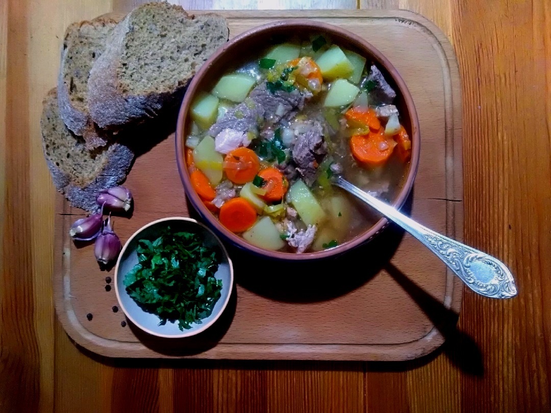Это суп из серии айнтопф — густые наваристые супы, объединяющие в себе и первое, и второе. Еще его называют «Рагу Бисмарка», за то что он полюбился немецкому канцлеру на одном из курортов. Я считаю, что наши мужья ничем не хуже Бисмарка, так давайте же и их побалуем этим супчиком с мудрёным названием, тем более что готовится он элементарно, справиться сможет даже начинающая хозяйка. На пятилитровую кастрюлю нам потребуется: Время приготовления — 2 часа. Некоторые сочтут такие масштабы промышленными, но при моем количестве едоков готовить меньше — только посуду пачкать. Мясо (обязательно трех видов!) освободите от жилок и жира, нарежьте достаточно крупными кубиками (примерно 3х3 см) и выложите на дно кастрюли. Картофель очистите, нарежьте крупными кубиками (2х2 см) и выложите поверх мяса. Репчатый лук мелко порежьте, обжарьте до золотистого цвета, выложите следующим слоем. Затем у нас идет морковь, нарезанная кружочками толщиной примерно 3 мм (естественно, предварительно почищенная). Оч