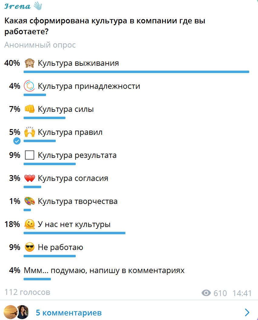 Оказалось, что 40% людей читающих мой канал, работают в культуре выживания, но к этому же ответу можно присоединить те 18%, которые считают, что культуры у них в компании нет. А это уже 58% к сожалению. А вот остальные типы культур распределились в диапазоне от 1 до 9%. Вот такой интереснейший результат получился, его еще стоит обдумать.