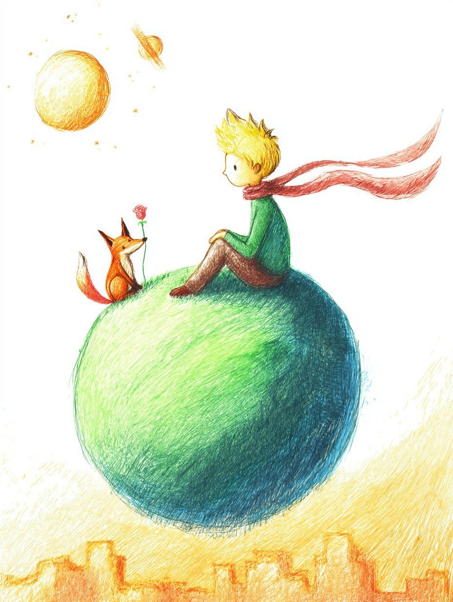 Автоперевод: Наивная иллюстрация маленького принца, сидящего на своей маленькой планете Нибиру, с маленькой красной лисой, он смотрит на розу в куполе, его шарф летает, очень грустная, но красивая, прекрасная, художественная живопись для водяного цвета, очень наивный, абстрактный, чрезвычайно простой и дикий, почти плох