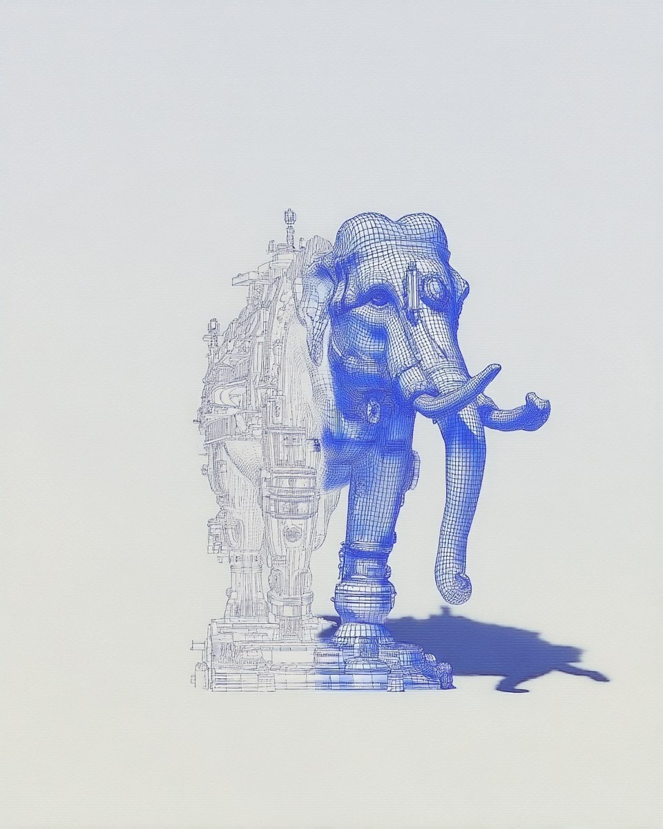 Создано на основе запроса: A 3D steampunk mechanical elephant portraiyed with half its body in viewport mode with wireframe and voxels and