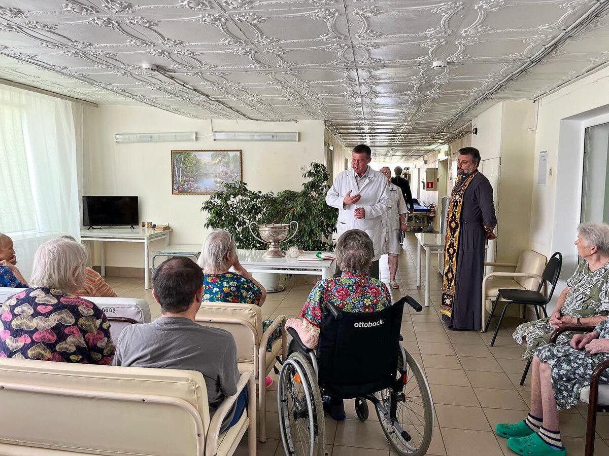 Благодушное терпение болезней и скорбей 24 апреля 2025 года На Светлой Седмице игумен Успенского мужского монастыря Новомосковска игумен Агафангел (Болдин) с главврачом Новомосковской городской больницы Вячеславом Голубенко посетили Отделение сестринского ухода села Гремячее. Отец Агафангел поздравил проживающих в хосписе со светлым праздником Христовой Пасхи, совершил водосвятный молебен и окропил святой водой палаты, и кабинеты хосписа, пожелав молившимся за богослужением Божией помощи. Во время пастырского визита отец игумен поздравил каждого пациента, вручив пасхальные пряники, специально подготовленные ООО «Медовые традиции», после чего побеседовал с больными отделения о благодушном терпении болезней и скорбей. В завершении отец Агафангел отметил, что это не первый визит монастыря в лечебное учреждение, складывающийся в добрую традицию духовного окормления Отделения сестринского ухода села Гремячее. Соб. Инф.