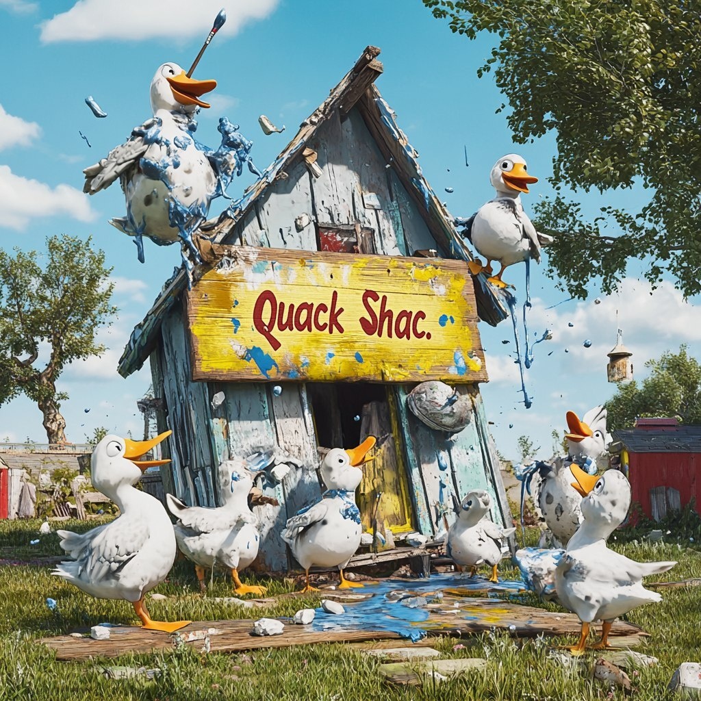 Создано на основе запроса: A whimsical, funny scene of a rustic duck house named "Quack Shac." Gray and white ducks are clumsily trying to paint a large wooden sign that says "Quack Shac." Some ducks hold paintbrushes in their beaks, some are splattered with paint, and one duck is hanging upside down from the roof, dripping paint everywhere. The duck house looks homemade and quirky, with bright, cheerful colors and set in a grassy yard under a blue sky. The mood is playful and cartoonish. --- Автоперевод: Причудливая, забавная сцена деревенского утиного дома под названием «Шак -шак». Как тебе генерация? 🤔 https://dzen.ru/id/65c0c65c86e4f837c27b24d7 #ИИ #AI #нейросеть #midjourney #art