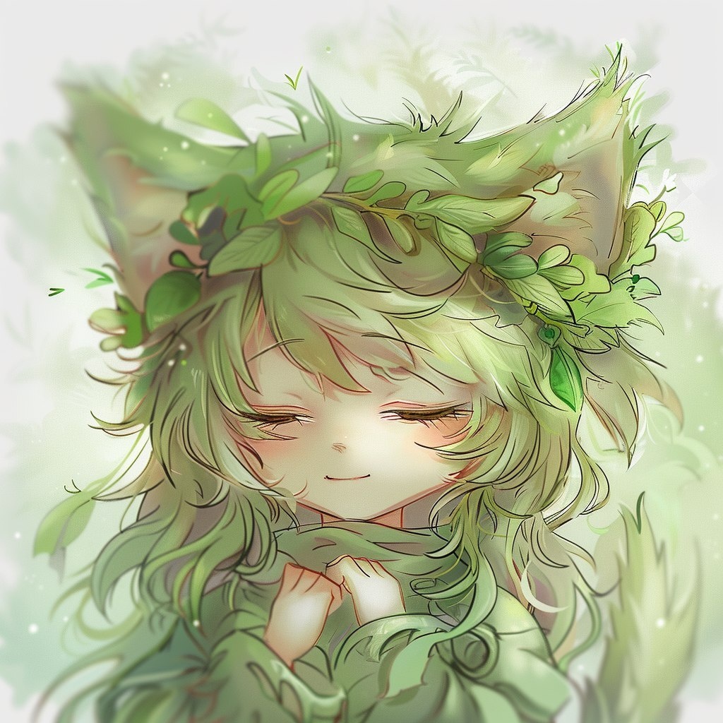Создано на основе запроса: cute anthropomorphic animal character, wide open large bright eyes, awake, lively expression, front-facing or slight angle, slightly slanted eyes (tsurime), humanoid body, wearing simple clothes, soft greenish fur, small leaves around ears, pastel soft background