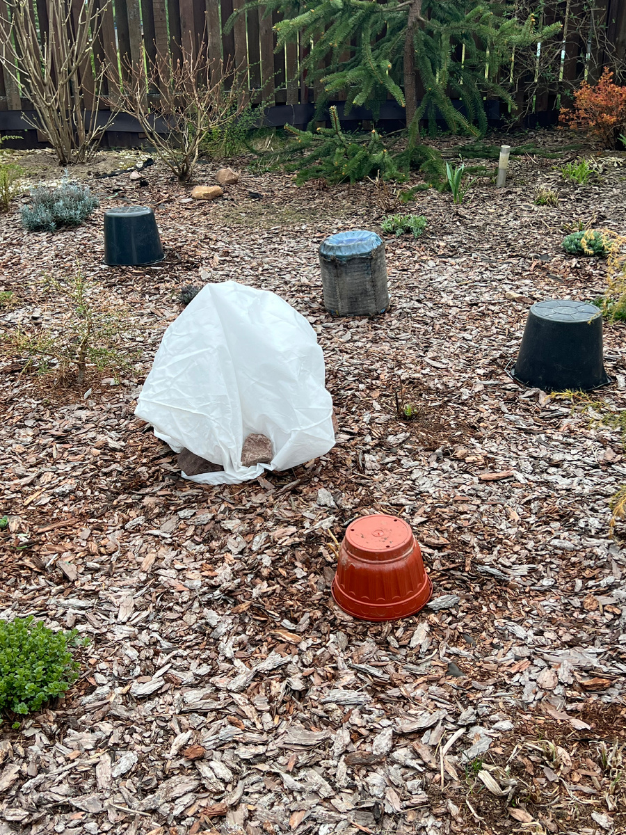 Я не готова терять цветение, да и вообще, когда зимой растения пережили холода и отсутствие снега весной из-за нескольких дней просто жаль потерять любимцев. А вы заметили, что в первую очередь укрываем самые любимые растюшки, самые ценные, ну а потом остальное. Очень не люблю закрывать-открывать, но погода на улице и снежинки, которые я застала по дороге домой из питомника, где забрала свои новые гортензии, чтобы оставить их в тепле, заставили напрячься. Вон там будут согреваться малыши гортензии из р9 посаженные прошлым летом. Такие они шустрые, уже все распустились почти. Посередине роза Супер Трупер Летом от нее глаз не оторвать. Хоть и говорят, что розам этот мороз не мороз, но мне не сложно и ее от ледяного ветра укрыть Вот так укрыла Хосты с уже длинными ростками Хоста сохранится под горшком Здесь уже более высокие кусты гортензий. Две палки около самых длинных побегов и колпак. Снимать и одевать удобно, почки не сломаю. Как и говорила вам, на флоксы и мелкие многолетники горш