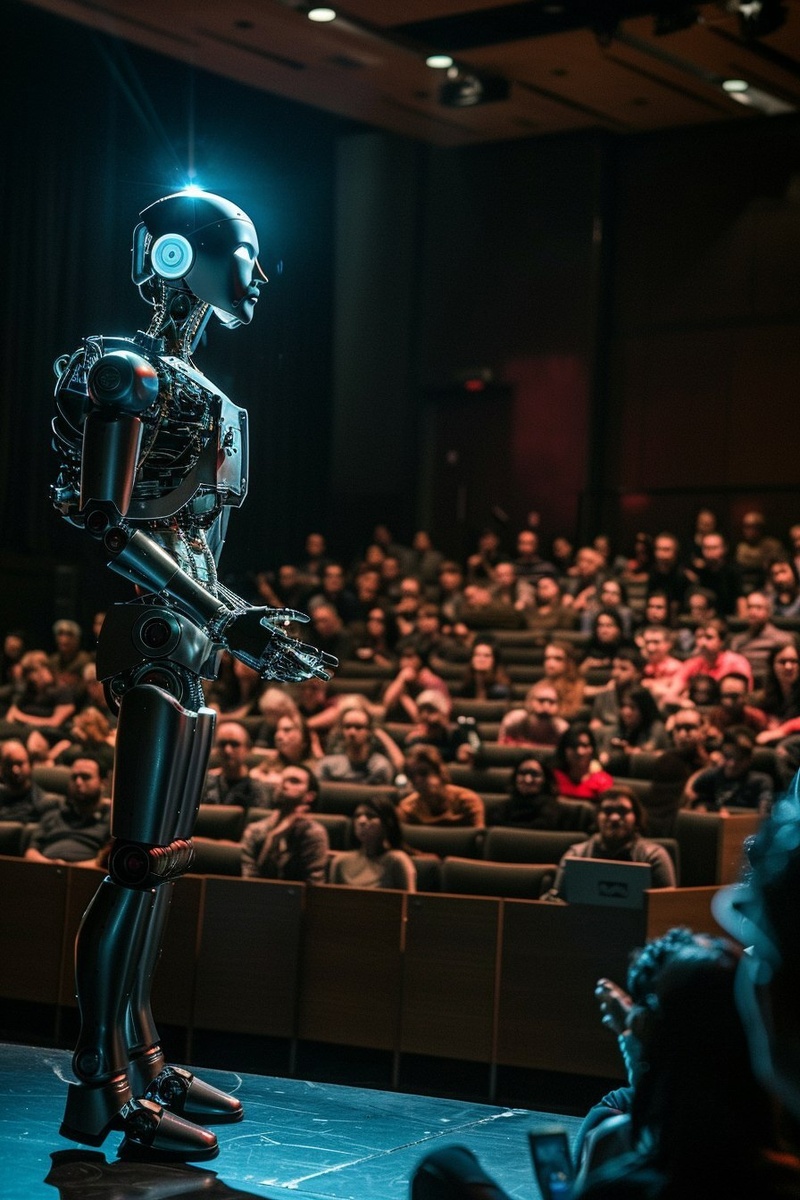 Создано на основе запроса: hyper-realistic photo of a massive human adience in a theatre style environment watching a robot on stage