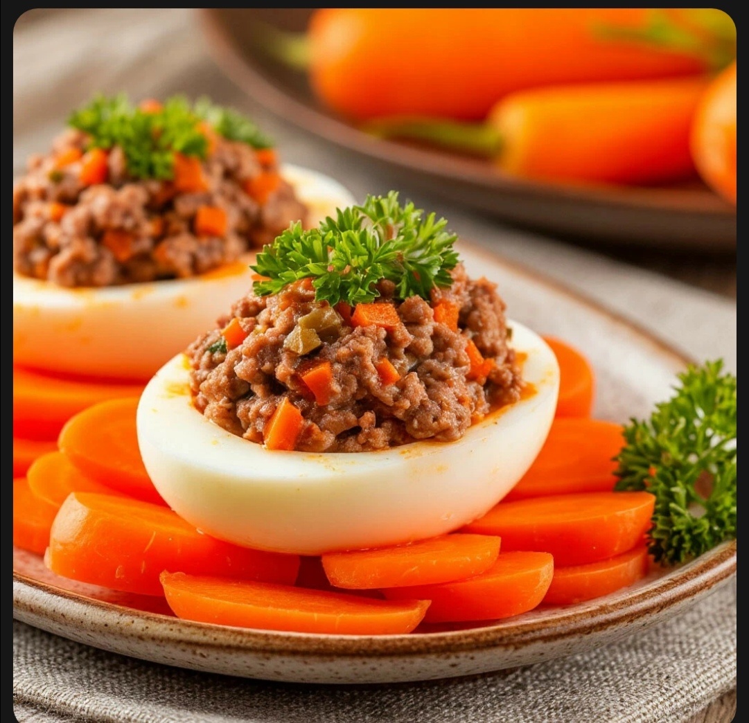 Для приготовления необходимо: - Морковь 1 большая 300 грамм - Фарш говяжий 300-400 грамм - Соевый соус 30 мл - Соль полчайной ложки 2,5 грамма - Перец чёрный молотый 1/4 чайной ложки 1,25 грамма - Растительное масло 20 мл 1) Куринные яйца заранее отвариваем, чистим от скорлупы, разрезаем на пополам, белки выкладываем в сторону, желтки выкладываем в глубокую миску. 2) Морковь, моем чистим от кожуры, при необходимости повторно споласкиваем. Трём морковь на мелкой терке, выкладываем в миску. Морковь также можно не тереть а резать мелким кубиком, будет более красиво. 3) Ставим сковороду на средний огонь, обжариваем фарш с обеих сторон до золотистого цвета. Подсаливаем добавляем молотый перец и перемешиваем. Выкладываем натертую морковь и обжариваем 5-7 минут на умеренном огне. В конце приготовления, добавляем немного воды и соевого соуса, перемешиваем. Когда обжарка будет готова выкладываем её в миску и даём остыть до комнатной температуры. 4) Желтки разминаем вилкой до однородной мас