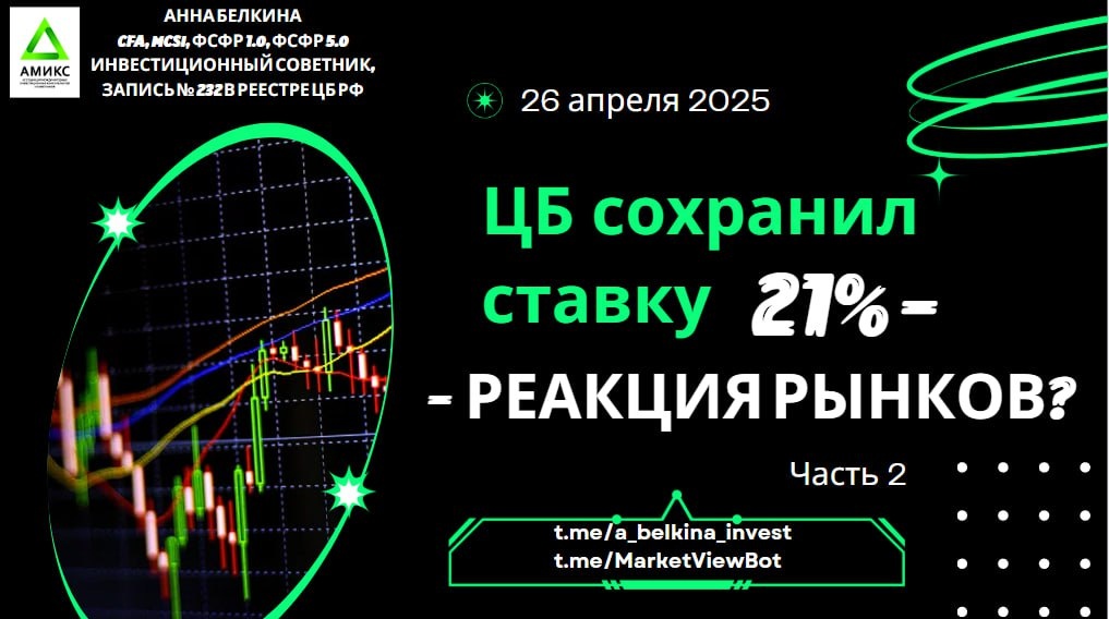 #video Приглашаю на просмотр видео! Тема – Заседание ЦБ РФ: ставка 21% - Реакция рынков. Часть 2. В первой части видео разбора мы посмотрели на ключевые параметры, которые оценивает ЦБ при принятии решения по ключевой ставке и спрогнозировали переход к смягчению ДКП ЦБ РФ. https://dzen.ru/media/id/65b8789ff12bfe0796a26941/video-680ce4a0cad039637d7557e0 В текущей (Часть 2) части видео разбора заседания ЦБ мы разберем Реакцию рынка на решение ЦБ и посмотрим на графики #IRUS, #MICEX, #USDRUB, #CNYRUB, #SI, #RGBI. Youtube: https://youtu.be/P0A9RbvVm_o RuTube: https://rutube.ru/video/a12d8af2877b1bf5ce1724b2c75eeaf5/ VK video: https://vkvideo.ru/video-229986162_456239023 Dzen: https://dzen.ru/video/watch/680ceb3b0ca79f7f606bb641 Не является ИИР