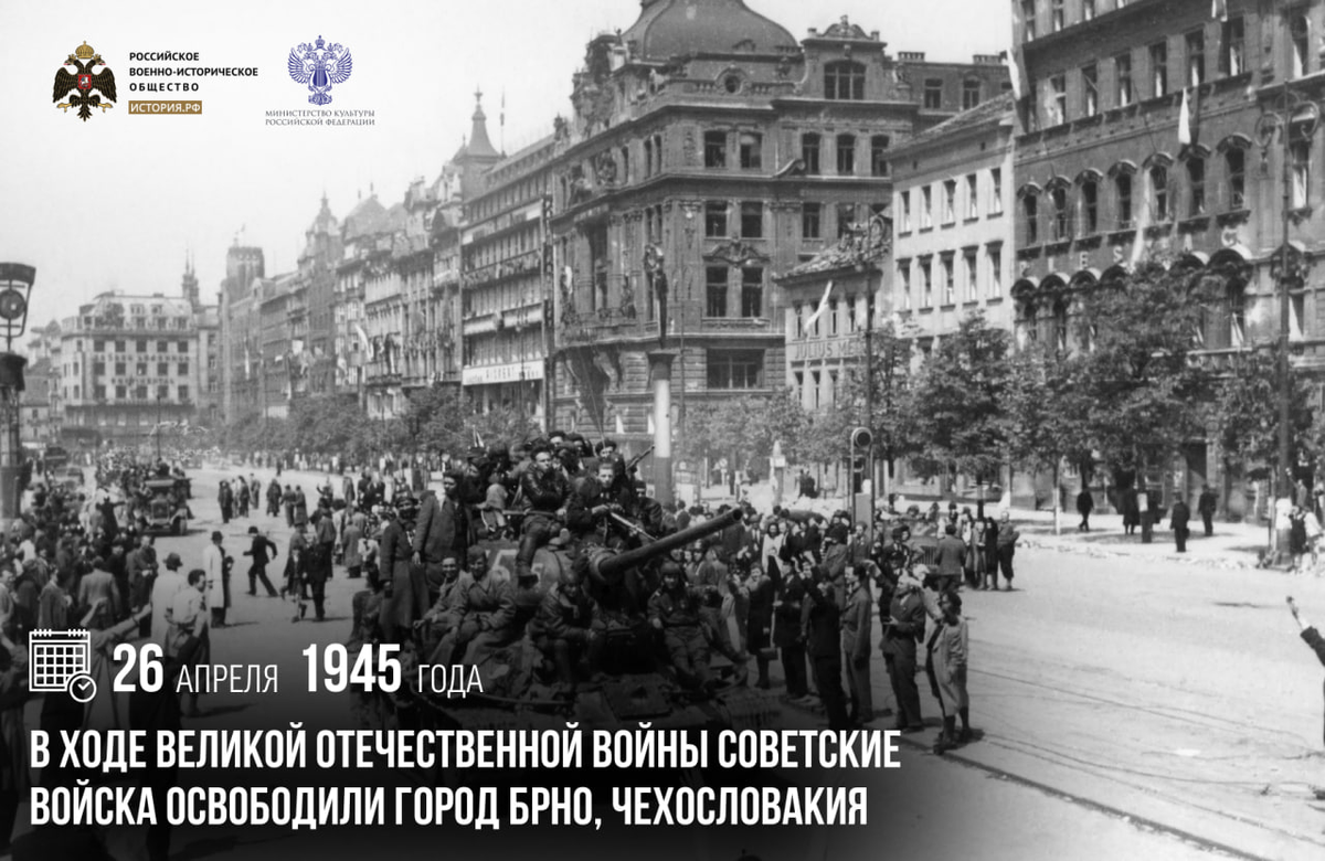 26 апреля 1945 года в ходе Великой Отечественной войны советские войска освободили город Брно, Чехословакия