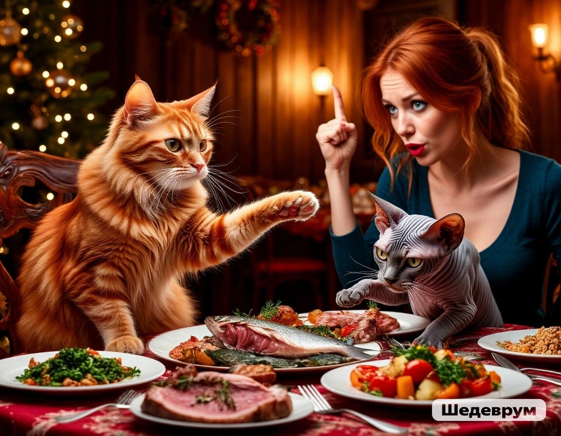 Гектор в этот момент реализовал план «Б»: пока все смотрели на Грету, он шмыгнул на стол и — оп! — стащил кусок ветчины.