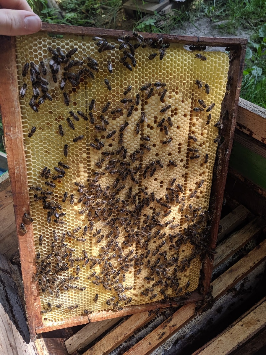 И так, продолжаю работать с пчелами. 23 апреля провел работу по удалению лишних свищевых маточников, оставил по одному маточнику. Открытого расплода нет, маточники новые заложить не должны. По плану матки должны выйти к маю. Буду ждать чтобы облетались. Старые матки сидят в отводках, некоторые уже расширил сушью и вощиной. У нас начинается роевая пора. Цветут яблони, груши, одуванчик и др. Похолодало, ночью заморозки. Пчелы неплохо работали при теплой погоде, самое интересное что в некоторых семьях пчелы без маток продолжали строить соты, при наличии свищевых маточников! В семье что пропала матка, увидел яички, осталось убедится что расплод будет пчелиный, а не трутовый!