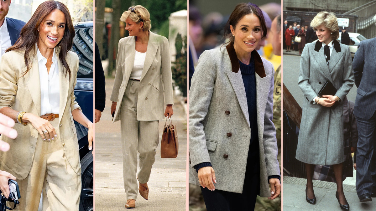 Твидовый пиджак Duccio от калифорнийского бренда Dôen серого цвета с пуговицами из искусственной кожи, лацканами и шоколадно-коричневым бархатным воротником был удивительно похож на тот предмет гардероба, который Диана носила много лет назад. Принцесса неоднократно надевала серое пальто в полоску с бархатным воротником, впервые появившись в нем во время посещения медицинского центра в Лиссон-Гроув в Лондоне в 1984 году, когда она сочетала его с черными туфлями на каблуках и белой рубашкой. Спустя несколько месяцев она надела почти такой же образ для посещения детского благотворительного фонда Barnardos.