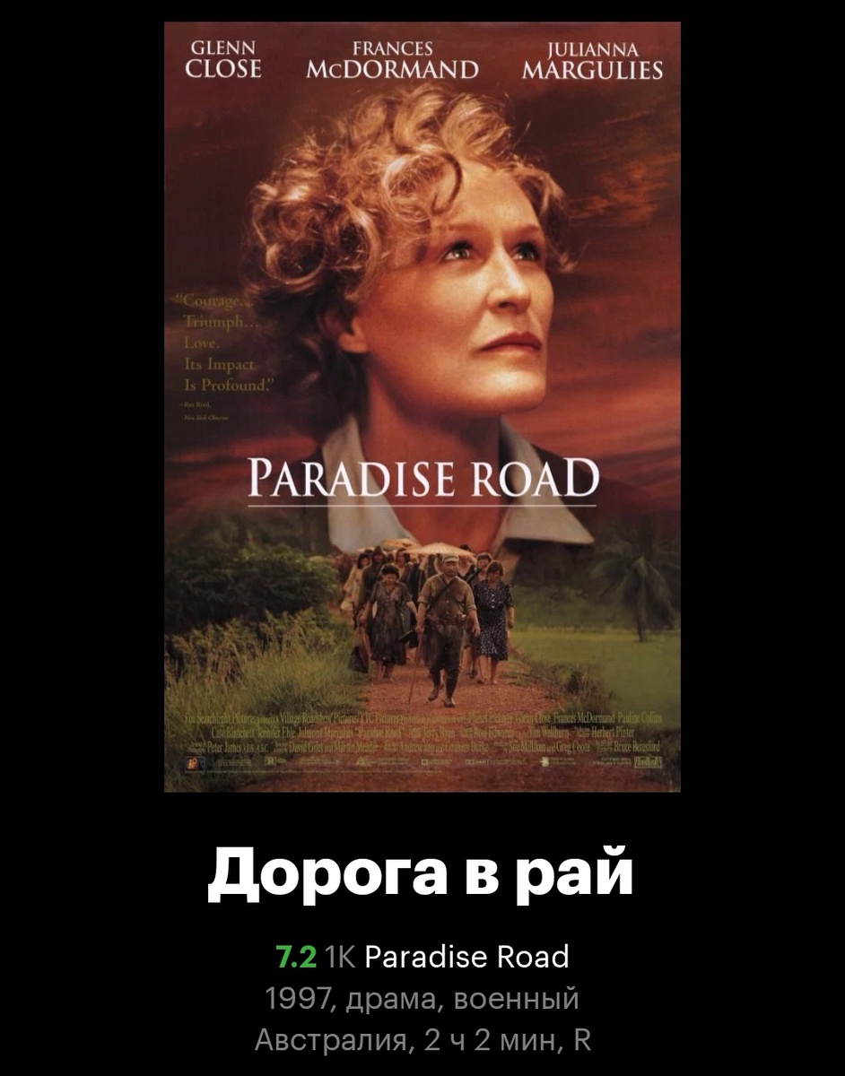 Все мы знаем историю и события Великой Отечественной войны, а также немного истории Европы и Америки во время Второй Мировой войны, но нам не очень много известно про то, что происходило в Азии, за исключением Хиросимы и Нагасаки, конечно. Поэтому посмотрев фильм "Дорога в рай", я немного узнала про события в этой части света того времени. После захвата Сингапура японцами в 1942 году, многие женщины из Европы, Австралии и других стран были отправлены в лагеря на Суматре. Условия, как вы понимаете, в этих лагерях были тяжёлыми и чтобы как-то поддерживать друг друга и силу духа, женщины организуют хор, который исполнял известные классические произведения без музыкальных инструментов. Фильм основан на реальных событиях, а в частности на мемуарах Бети Джеффри "White Coolies" и воспоминаниях Хелен Колийн "Song of Survival", которые были в этих лагерях. А ещё в фильм мощнейший состав: Гленн Клоуз, Фрэнсис Макдорманд, Кейт Бланшет, Джулиана Маргулис. Это, конечно, с одной стороны тяжелый