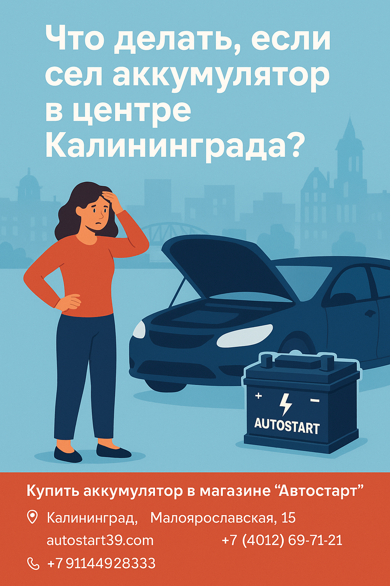 Проблема севшего аккумулятора — одна из самых частых неприятностей, с которой сталкиваются автолюбители. Особенно неприятно, если это случилось в центре Калининграда, где каждая минута на счету: пробки, плотная парковка, дела не ждут. Что делать? Паниковать точно не стоит. В этой статье мы расскажем, как быстро решить проблему, на что обратить внимание и где найти надежный аккумулятор с гарантией. Иногда стартер не крутит вовсе, а иногда еле-еле "пытается", но результата нет. Признаки севшего аккумулятора: Если под рукой есть провода и рядом найдётся доброжелательный водитель, можно попробовать завести автомобиль "с прикуриванием". Однако важно: В Калининграде достаточно быстро можно вызвать: Если вы знаете, что аккумулятору уже более 3–4 лет, если это не первая «заморозка», и если машина снова не заводится на следующий день — не тяните. Постоянное прикуривание не решает проблему, а только откладывает её. Лучше сразу заменить источник питания, чем оказаться в такой же ситуации на следу