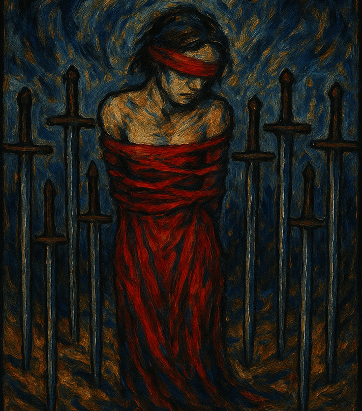 Восьмерка Мечей в Таро – это не просто карта, это леденящий душу образ отчаяния и скованности. Взгляните на нее: фигура, беспомощно связанная, словно жертва невидимого врага, окруженная острыми мечами, воткнутыми в землю, словно безжалостное напоминание об отсутствии выхода. А эта повязка на глазах… Она кричит о слепоте, о неспособности разглядеть даже крошечный лучик надежды, хотя земля под ногами ровная, а оковы кажутся хрупкими. Эта карта – эхо внутреннего заточения, шепот парализующего страха, который держит нас в плену иллюзорной безысходности.