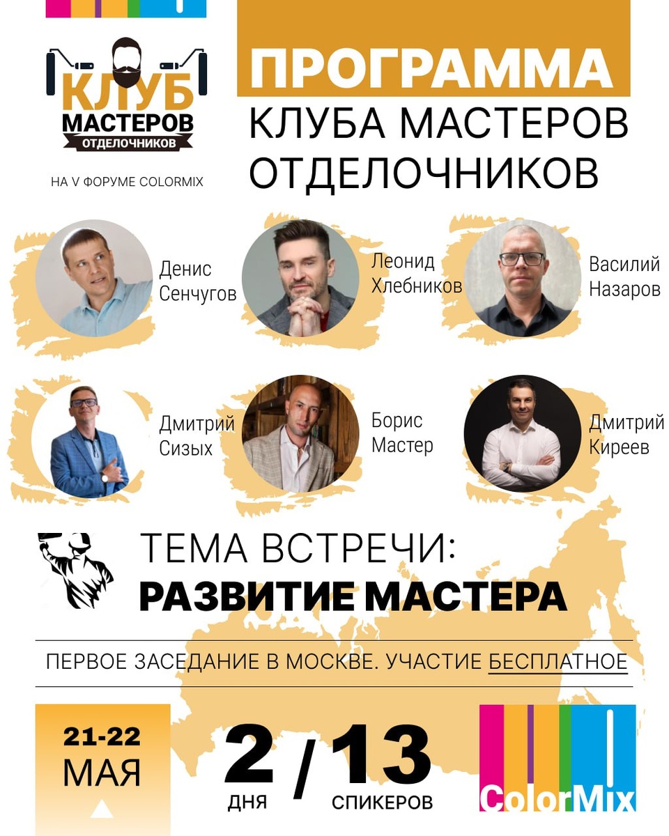🔥 Друзья, приглашаем на встречу Клуба Мастеров-отделочников, на V всероссийском форум мастеров ColorMix 2025, в Москве, в AmberPlaza. Уже скоро: 21-22 мая! ⭐️ Тема этой встречи: Развитие Мастера. В программе: - 2 дня. 13+ спикеров – известных Мастеров добившихся успехов. - Творческие встречи с известными Мастерами страны, на главной сцене. Некоторые темы: ⭐️ 2 пути развития мастера в отделочных работах. Дмитрий Киреев, Основатель проекта «Cтроитель при деньгах» ⭐️ Из мастера в бизнесмены. Личный опыт. Леонид Хлебников, Руководитель Вернисаж Паркет ⭐️ Как мастеру продать образец клиенту. Денис Сенчугов, Основатель Академии декоративной отделки. ⭐️ Как повысить заработок мастера: научись страховать свою работу! Василий Назаров, Мастер отделочных работ, блогер. ⭐️ Как мастеру увеличить свой доход в 2 раза Дмитрий Сизых, Основатель ремонтной компании ДОМ РИО. 👉 Вся программа: https://colormix-expo.ru/programm.php#section4