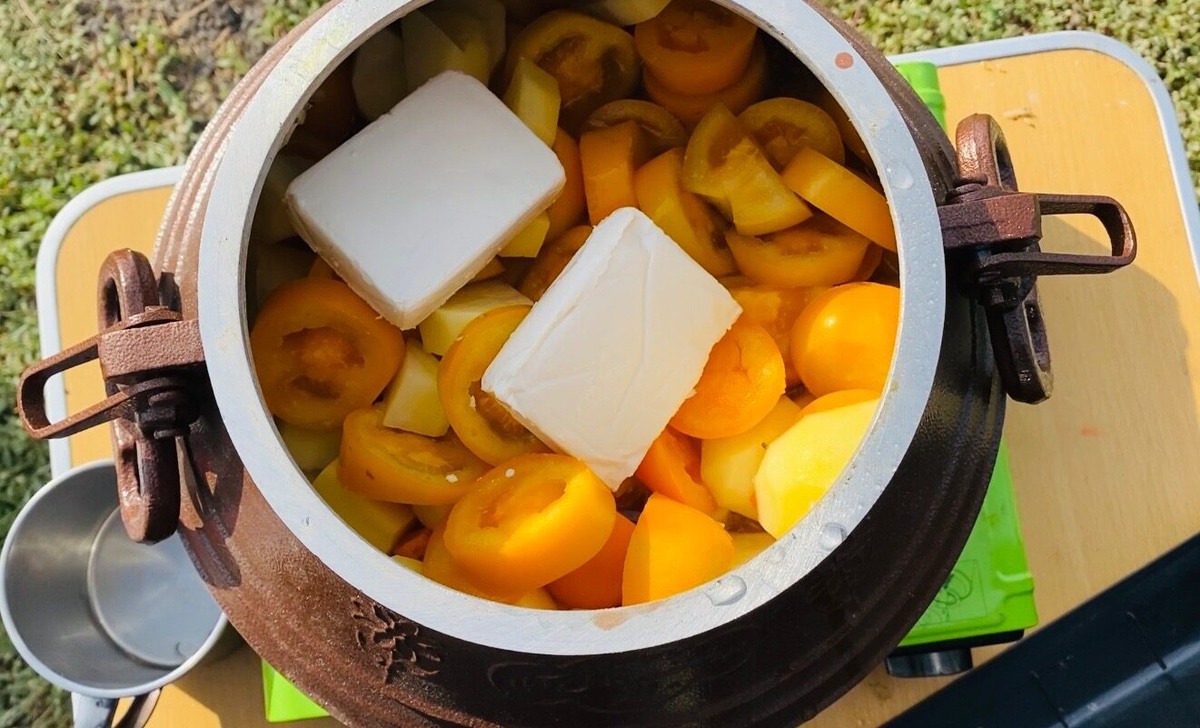 Довожу мясо до полуготовности в пустом казане обжаривая на масле, далее кладу слои овощей, вливаю литр воды и довожу всё до кипения. Накрываю крышкой с клапанами. Ровно через 45 минут высокого давления спускаю клапаны, жду, пока выйдет пар.