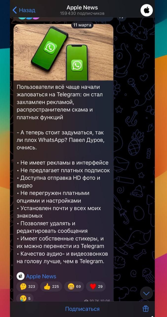 WhatsApp совсем скатился мессенджер начал закупать антирекламу Telegram прямо в Телеграм-каналах