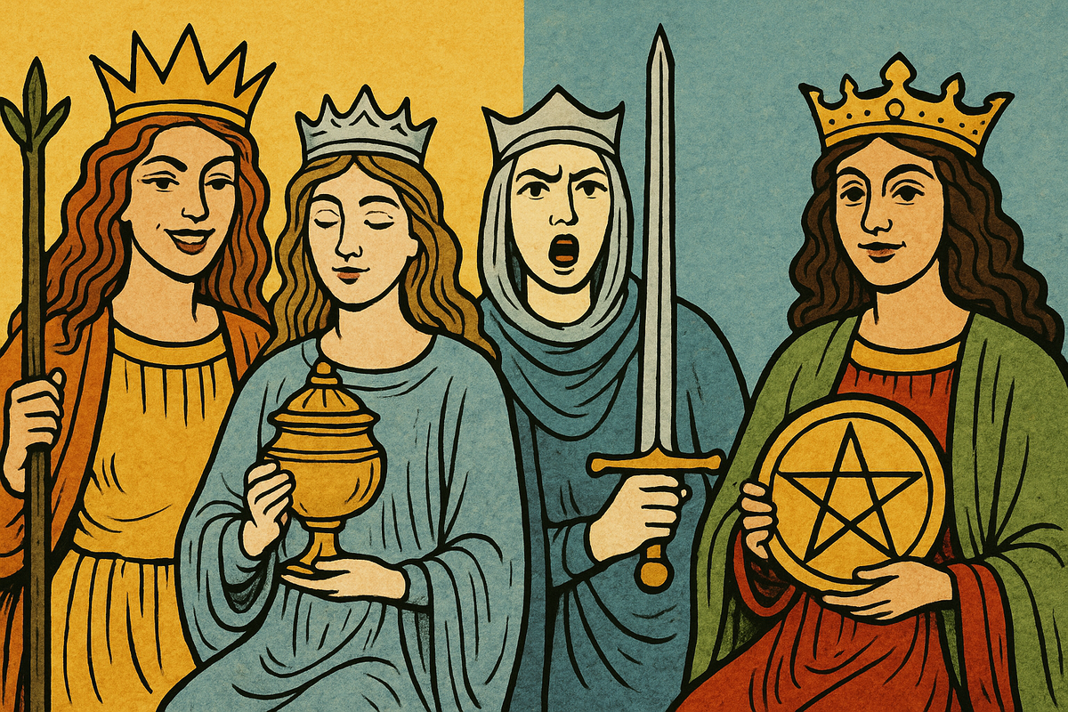 Четыре Королевы Таро — Жезлов, Кубков, Мечей и Пентаклей.