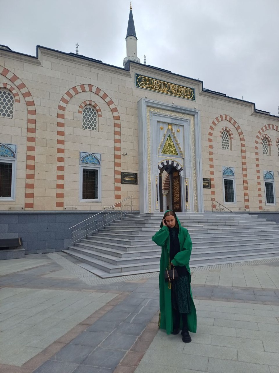 Сегодня мне посчастливилось побывать на интересной экскурсии в Симферопольской соборной мечете, которая была построена в 2023 году. О самом ее строительстве можно прочитать в интернете , а мне б хотелось рассказать о своих впечатлениях экскурсии. Территория соборной мечети очень красивая , большая и ухоженная, зеленые пышные ели украшают и добавляют атмосферы. При входе в мечеть вы можете надеть мантию зеленого цвета.Зелёный цвет в исламе ассоциируется с раем, чистотой и процветанием. Так же на изумрудном фоне внутри и снаружи написаны цитаты и молитвы из Корана. Сама мечеть построена в сдержанно-роскошном стиле: витражи на окнах , ковры с изображением лепестков тюльпана ( еще одним из символов ислама) , а также разные цвета лепестков тюльпана- имеют разное значение. Красивые расписные купала и не менее красивые и имеющие внушительный вид- люстры . Двери украшенные мозаикой и уютный дворик . Самое большое впечатление на меня произвели -купала расписанные в ручную мастерами из Крыма за