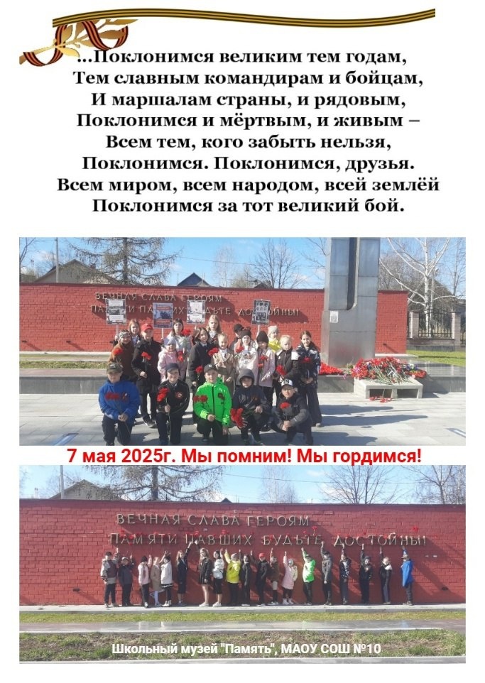 Школьный музей Боевой и трудовой славы "Память" МАОУ СОШ №10, г. Кушва, Свердловская область 7 мая 2025 г., ранним утром школьным автобусом мальчишки и девчонки с активом музея "Память" по сложившейся традиции отправились к Мемориалу погибшим в госпиталях нашего города. Мы считаем, что каждый ученик нашей школы должен побывать на этом святом месте. Исторические факты На втором этаже нашей школы здания №2 на мемориальной доске написаны имена и фамилии погибших в госпиталях. Её сделал бывший директор школы №42 Кутуев Лев Александрович, а имена восстановлены были благодаря поисковой работе в те годы учителю географии Кузнецовой Валерии Семеновне и ее отряду РВС. Сегодня... Помнить, беречь, не предавать и благодарить - это все, что нам остается. НО ЭТО НЕМАЛО! А ДЛЯ ЭТОГО НУЖНО ЗНАТЬ! Автобус сделал 2 рейса. У памятника мы вспомнили историю.... Возложили цветы...Украсили надпись, клумбу... Забывать не имеем права! Источник: Кушвинская Правда Источник