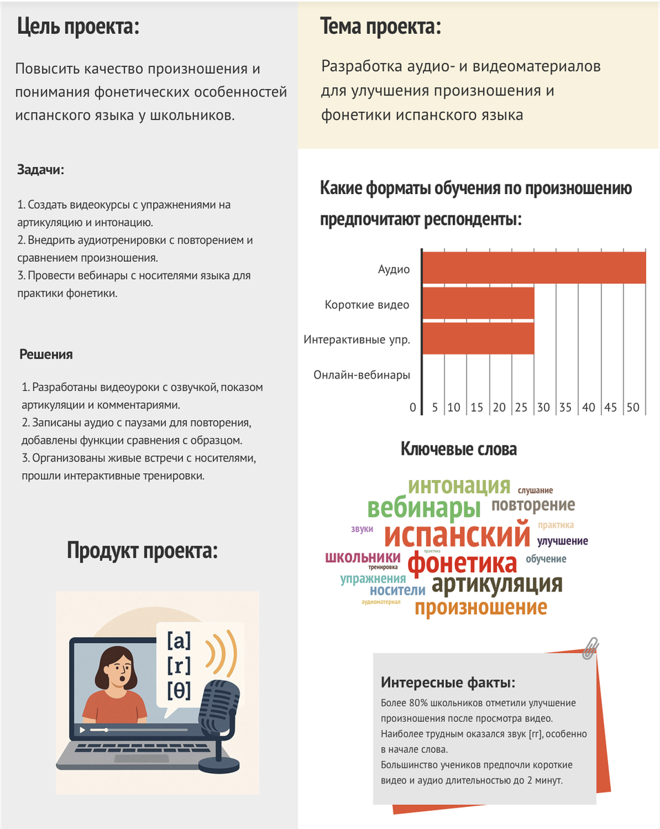 Информационный лист: https://infogram.com/oformlenie-rezultata-proekta-1h1749w8k88vq2z Задание: Проанализируй проект по ключевым элементам Прочитай информационный лист проекта в текстовом документе и выполни задания ниже. Составь информационный лист по своему проекту. Обрати внимание на структуру и заголовки. Тема Как ты понимаешь тему проекта? Сформулируй её своими словами. Цель Почему именно такая цель выбрана? Чем она важна? Задачи Какие шаги нужно выполнить для достижения цели? Запиши хотя бы три задачи. Решения по задачам Как можно реализовать каждую задачу на практике? Приведи примеры решений. Облако ключевых слов Назови 3–5 ключевых слов, которые, по твоему мнению, наиболее важны для проекта. Почему? Графическое представление проекта Что изображено на иллюстрации? Как она связана с темой проекта? Диаграмма с результатами Что показывает диаграмма? Какие выводы можно сделать? Интересные факты Какие факты ты бы добавил(а) по теме?