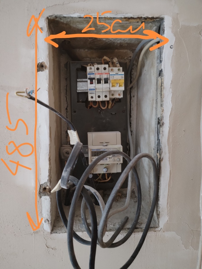 Что можно установить в качестве электрощитка в такую вот нишу (шириной 25см, высотой 48, 5 см и глубиной 17 см, с небольшим сужением вовнутрь)? Все готовые встраиваемые шкафы не подходят по размеру (ниша слишком узкая и высокая). Думаю про панель с пластроном, но тоже готового под эти размеры пока не нашлось. И непонятно, как крепить пластрон - они обычно держатся за боковые опоры, но сбоку опять же не подлезть перфоратором, ниша слишком узкая. Зато на задней стенке вмурована деревяшка, к которой можно прикрепить панель. Но хочется, чтобы провода и прочее опасное хозяйство было прикрыто пластроном или ещё как-то. Есть какие-нибудь конструкции подходящие в продаже? При этом хотелось бы побольше места полезного на дин-рейке, ибо нужно 6 модулей под счётчик и не меньше 12 под остальное (автоматы, ркн, узо).