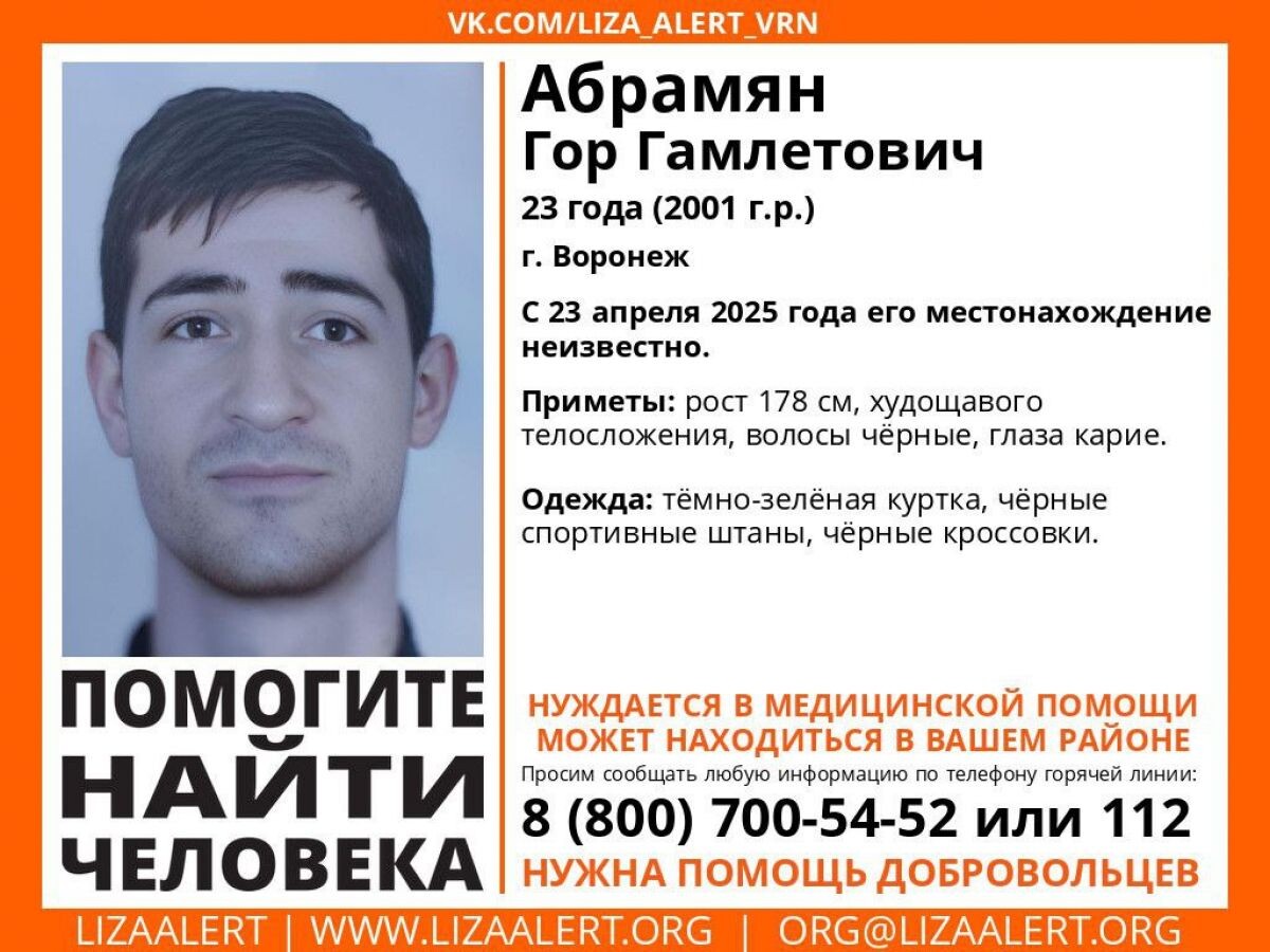 В Воронеже пропал 23-летний Гор Абрамян. Молодой человек ушел из дома 23 апреля и до сих пор не вернулся домой. Ориентировку распространили волонтеры поискового отряда "ЛизаАлерт" в Воронежской области. Рост Гора составляет 178 сантиметров. У молодого человека черные волосы, карие глаза и худощавое телосложение. Парень был одет в темно-зеленую куртку, черные спортивные штаны и черные кроссовки. Волонтеры сообщают, что пропавший нуждается в медицинской помощи. Если вам известно возможное местонахождение Гора Абрамяна, просьба сообщить об этом в полицию по номеру 112 или позвонить по телефону, указанному на ориентировке. Ранее волонтеры сообщали о пропаже 7-летнего Вовы Паршутина. Мальчик пошел гулять во дворе около 18:00 часов 7 мая и не вернулся домой. К счастью, утром 8 мая стало известно, что мальчика нашли живым и вернули родителям.