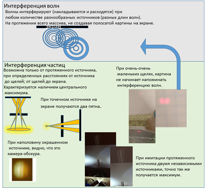 Поскольку…. Иногда…. Эээ…. В общем, мы решили нарисовать что-то вроде шпаргалки по этим трем явлениям. Ее можно распечатать и держать где-нибудь неподалеку, на случай склероза, например. Она будет в самом конце. 1. Интерференция. Интерференция – это взаимное усиление или ослабление волн при их наложении друг на друга. При наложении волновых фронтов в фазу происходит усиление, при наложении в противофазу – ослабление. И даже взаимное гашение. На самом деле, волны друг друга при этом не гасят. Этот миф появился в результате попытки объяснить поведение света волновой теорией. У волны просто происходит затухание, вследствие «размазывания» энергии колебания по массиву среды. У волн нет интерференции на экране, они подходят к нему двумя целыми волновыми фронтами, сначала фазой, потом противофазой. Мифические электромагнитные волны тоже друг друга не гасят, поскольку когерентность предполагает в какой-то момент времени только фазы, в другой момент времени только противофазы, в третий – отсутс