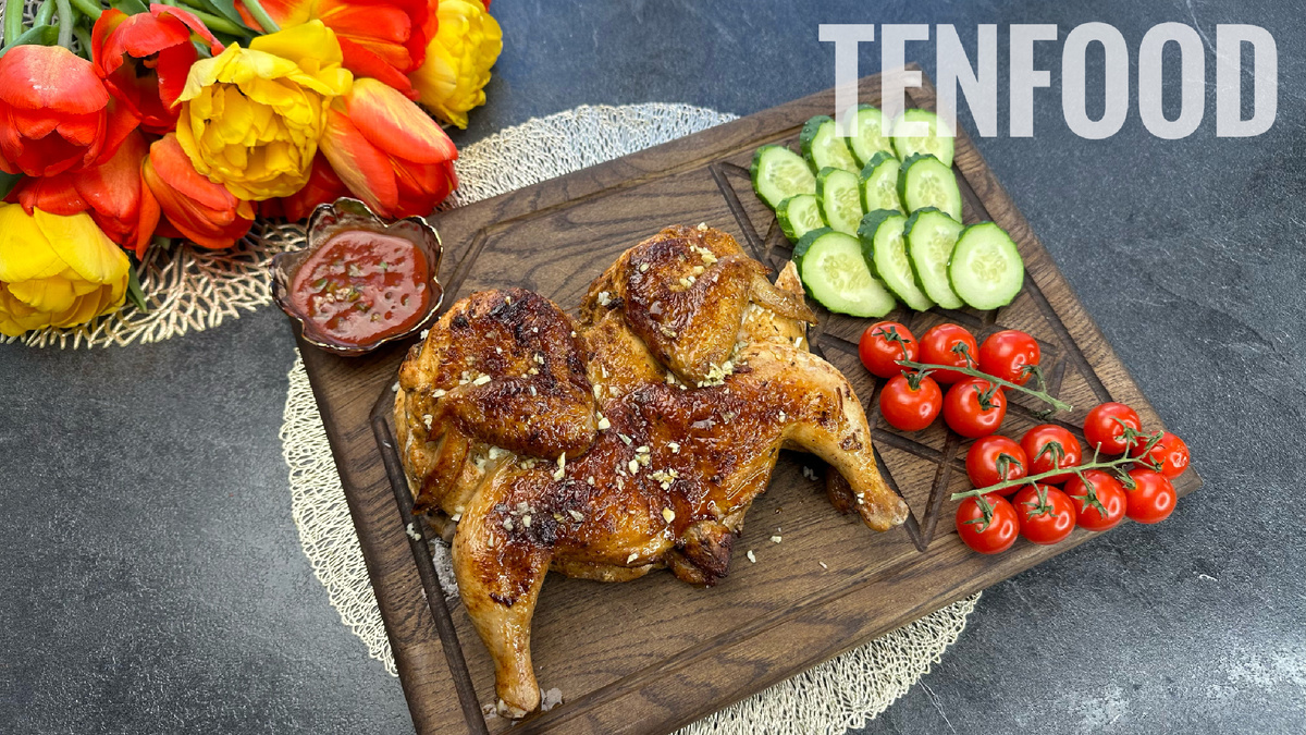 Сегодня будем готовить вкуснейшие цыплята тапака! Или цыплята табака - как его все называют . Вкуснее и проще блюда не придумаешь! Это правда вкусно . Итак начнем . 2.Теперь накрываем пленкой , чтоб не испачкать брызгами , хорошенько отбиваем цыплят с двух сторон 3.нарезаем лук 2шт-300гр 4.добавляем к луку: томатный сок 100гр, кориандр 1ч.л, черный перец1ч.л , паприку 2ч.л , хмели сунели 1ч.л , чеснок сушеный 1ч.л , базилик сушеный 1ч.л и все хорошенько разминаем рукой , чтобы сок луковый смешался равномерно со специями и томатным соком 5.теперь этой смесью хорошо натираем цыплят со всех сторон и отправляем в холодильник мариноваться на ночь . Если маринуете на 2часа , то оставляйте на столе при комнатной температуре . 6.перед жаркой цыплят надо предварительно вынуть из холодильника за два часа , чтоб они стали комнатной температуры. 7.теперь стряхиваем с цыплят весь маринад , лук чтоб не горел на сковороде. 8.разогреваем сковороду до средней температуры и обжариваем на од