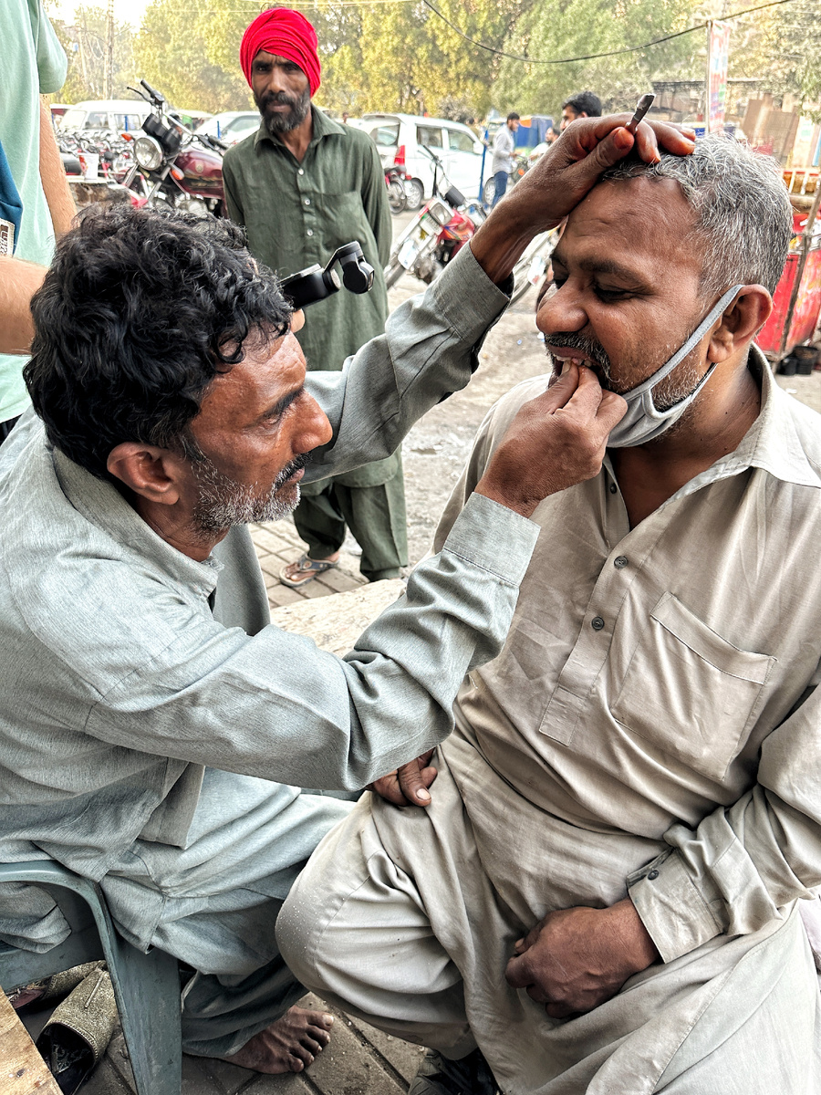 Недавно мы посетили Пакистан, где на улицах города Лахор наблюдали удивительную картину — уличный стоматолог вставлял мужчине зубы прямо на тротуаре. Казалось бы, это безумие и такого просто не может быть, но в Пакистане уличные доктора до сих пор популярное явление. Сейчас мы покажем и расскажем, как это выглядит. Еще до поездки в Пакистан мы много слышали про уличную медицину этой удивительной страны, но всё-таки нам казалось, что на дворе уже 2025 год, и такие вещи должны остаться в прошлом, или остаться лишь постановочными для развлечения иностранных туристов. Но как оказалось, такие доктора до сих пор существуют в реальной жизни. Только посмотрите на наши снимки из Лахора! Разве так вы представляете себе зубного доктора? Мужчина (и он там далеко не один) сидит у какой-то стены на очень оживленной улице в центре Лахора, где мимо проносятся сотни машин, тук-туков и грузовиков. Когда мы увидели эту картину, то просто не могли поверить своим глазам. Вставить новые зубы вместо выпавш