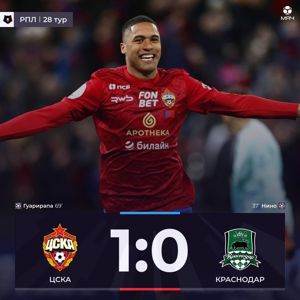 ЦСКА побеждает "Краснодар" в центральном матче тура, благодаря голу вышедшего на замену во втором тайме Гуарирапы⚽️ Споры вокруг гола начались сразу же, но судья Карасев после проверки ВАР офсайда не увидел и взятие ворот засчитал. Было или не было - решать теперь болельщикам😁 За два тура до конца ТОП 3 выглядит так: Краснодар: 28 матчей; 61 очко Зенит: 28 матчей; 60 очков ЦСКА: 28 матчей; 55 очков