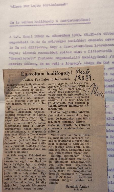 В конце 80-х, когда в Венгрии осмелели сторонники Запада (они же противники Советского Союза), история с военнопленными стала одной из популярнейших в пропагандистской войне против СССР. И было совсем уж удивительным, что отпор любителям поскорбеть в СМИ на эту тему часто давали сами бывшие военнопленные. В венгерских газетах я не раз встречал их отповеди. И однажды решил встретиться с автором одного такого письма, опубликованного в газете венгерских коммунистов «Непсабадшаг» 19 июня 1989 г. Как выяснилось, на газетной полосе письмо появилось со значительными сокращениями. Но по моей просьбе редакция предоставила мне не только контакты автора, но и копию полного текста письма. Перевод его я и хочу опубликовать сегодня. Ибо вижу в нем ценное историческое свидетельство.
